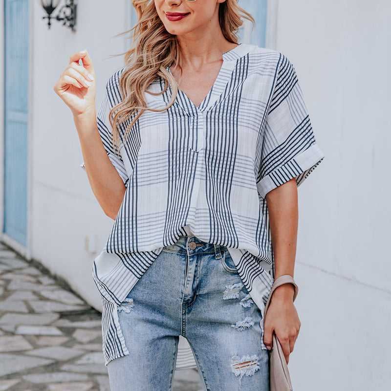 T-shirt à carreaux à manches courtes et col en V pour femmes