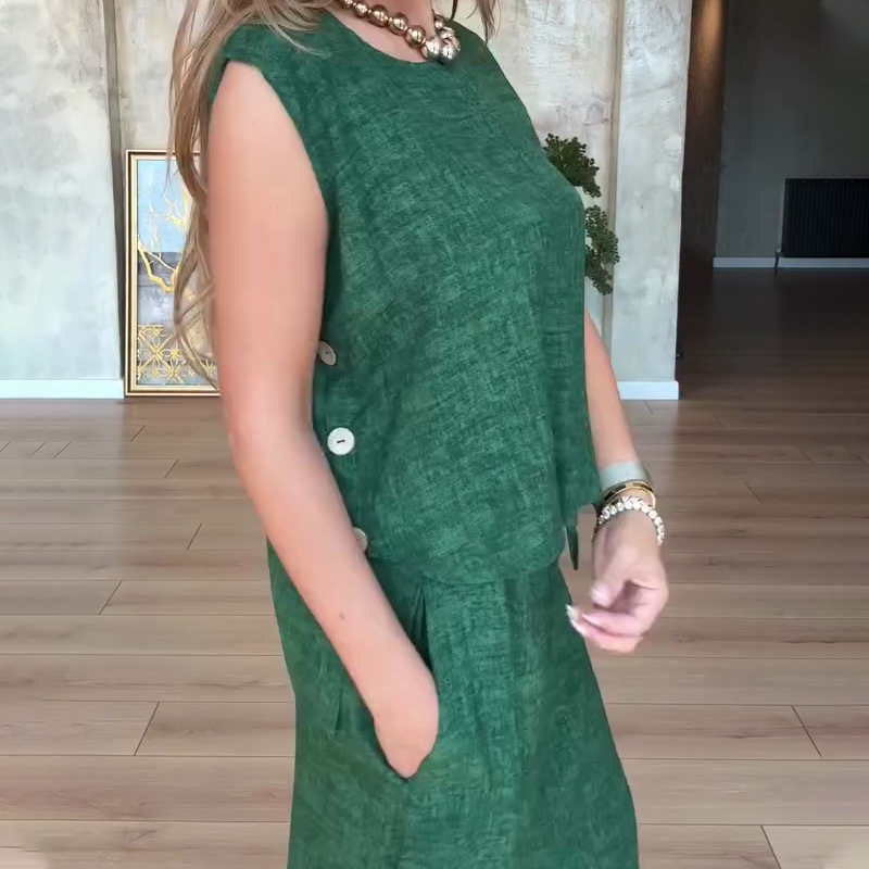 CONCEPTION DE MODE : le haut sans manches est doté d'un détail unique à boutons multiples des deux côtés et d'un ourlet asymétrique (plus court à l'avant, plus long à l'arrière) pour une touche d'élégance. Le pantalon à jambe large comporte des poches fonctionnelles, alliant l'aspect pratique à l'esthétique moderne.